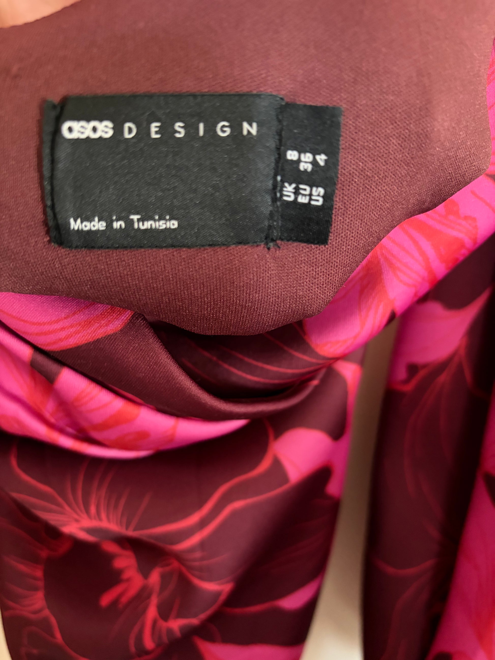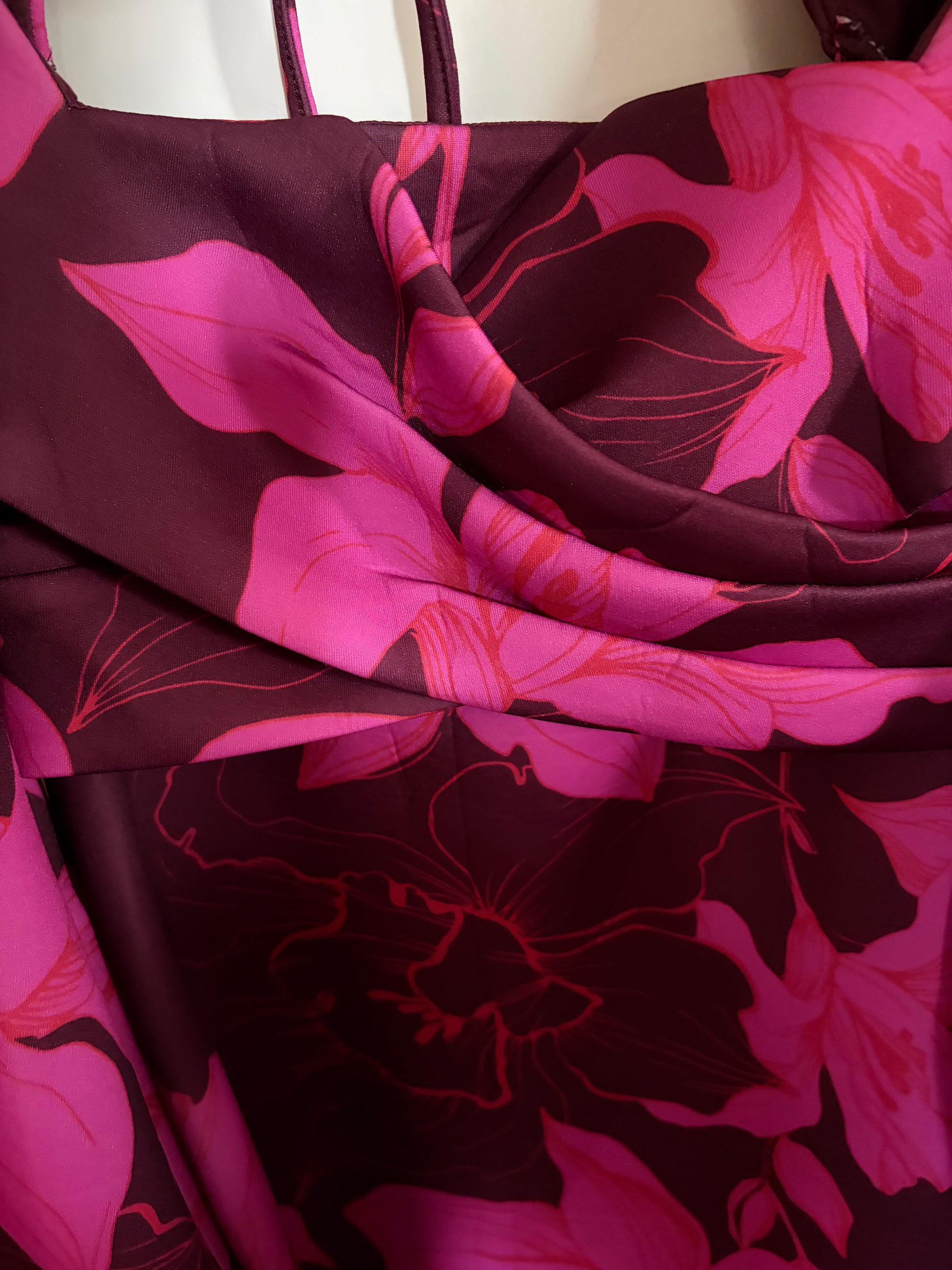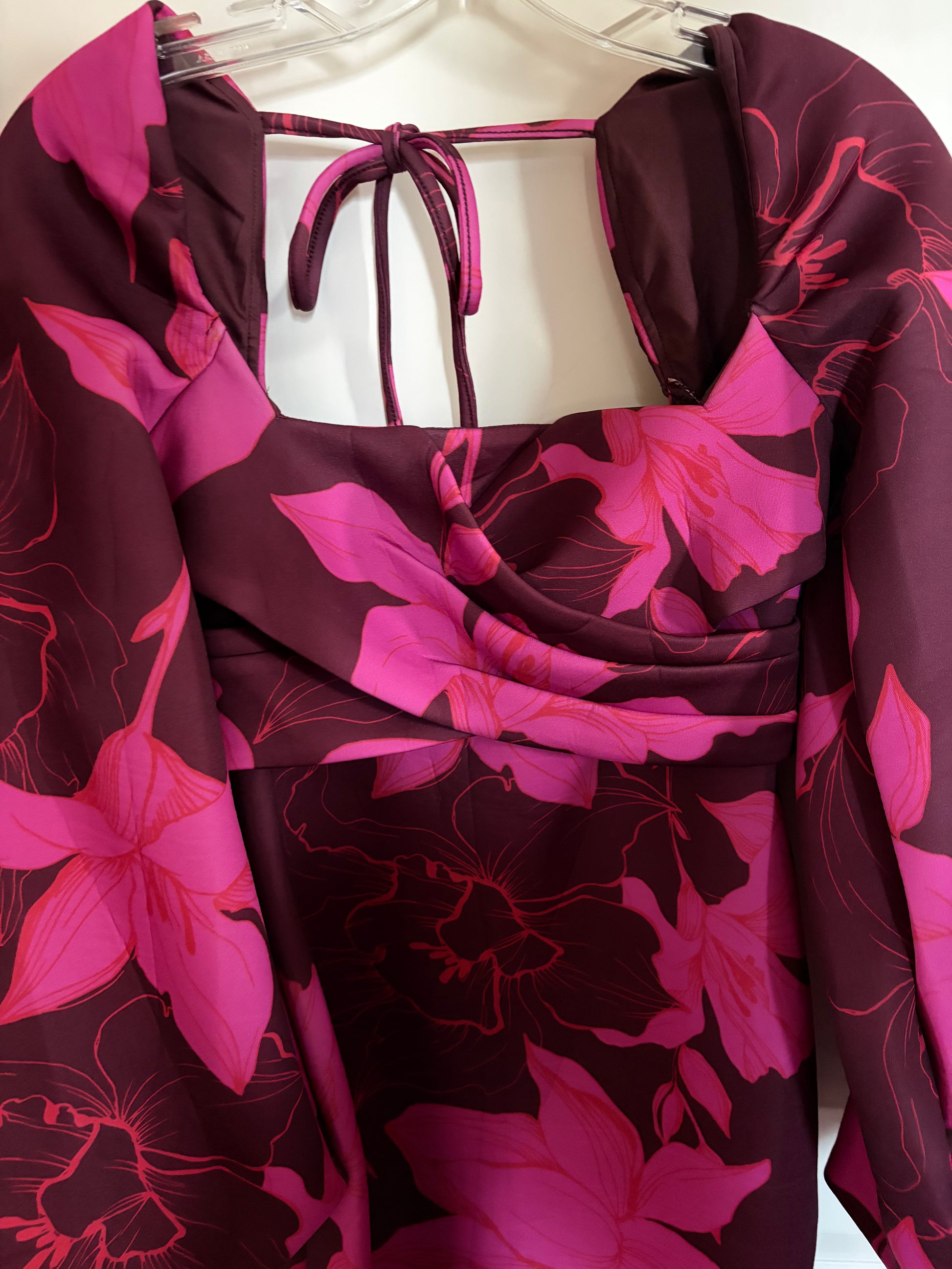 Step out in style with this elegant floral pencil dress. Square neck wrap around bust line. Oversized super sleeves. Body on with bold pink burgundy oversized floral print. Soft light weight polyester with straight cut hem. Beautiful.