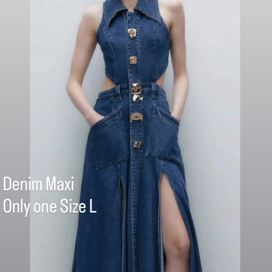 Heavy dark denim with splits in front of pleated back. Open back with gold embellished buttons. Loved. Size L