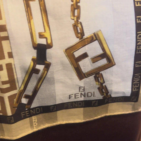 Elegant Fendi silk scarf featuring iconic logo design. Shades of brown, gold, and cream. Beautiful scarf cotton/silk blend. Tag removed. Approximately 23” x 24”.